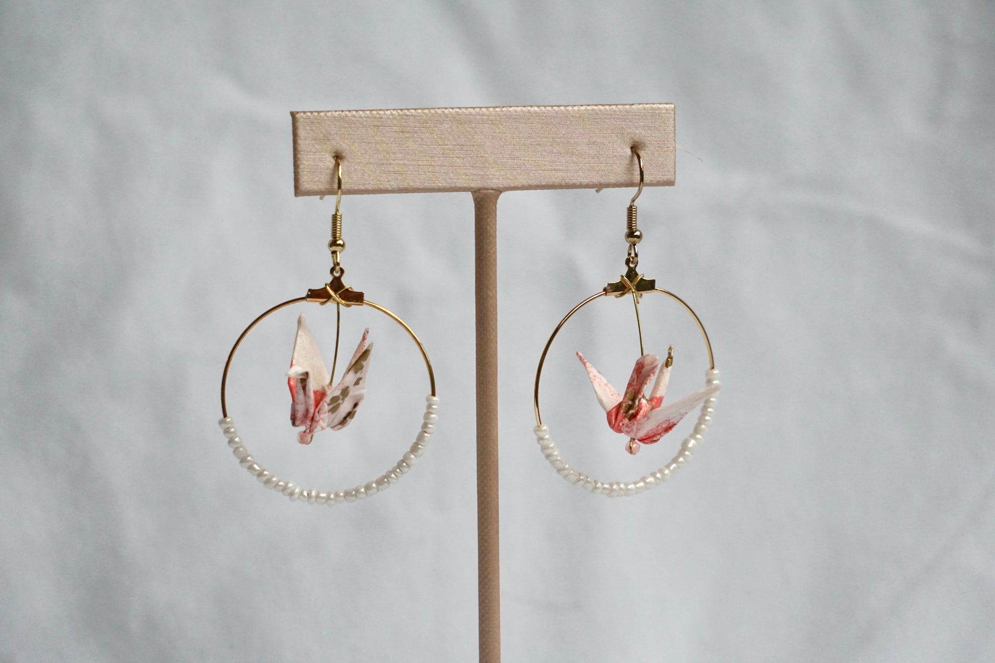 Gold hoops with small light pink beads and small pink cranes with gold flower accents